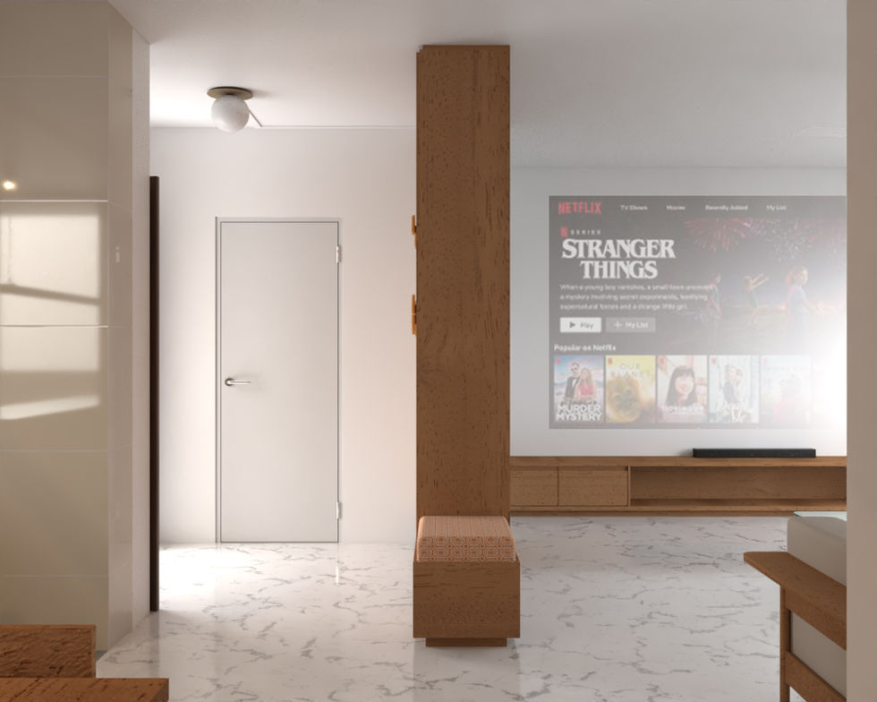 The living area is anchored by a low, continuous timber console, which doubles as a visual grounding element and a projection surface. Here, technology is elegantly woven into the architecture, as the clean white wall becomes a canvas for film, bringing the home to life through the warm glow of cinema. The cabinetry is meticulously detailed, flush and unadorned, emphasizing material honesty and craft.