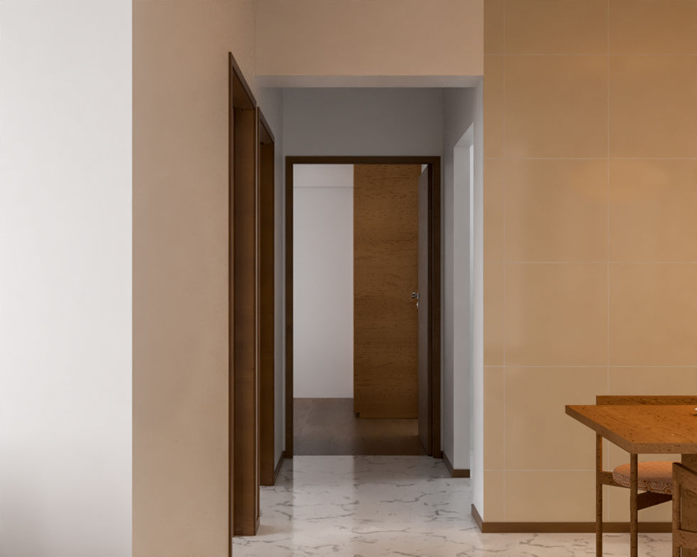 Upon entry, a muted palette of white walls and soft marbled flooring sets a serene backdrop. Timber volumes are thoughtfully introduced not as decoration, but as spatial markers, defining zones without the need for heavy partitions. This idea of gentle separation allows light to travel uninterrupted, lending a sense of spaciousness to the floor plan.